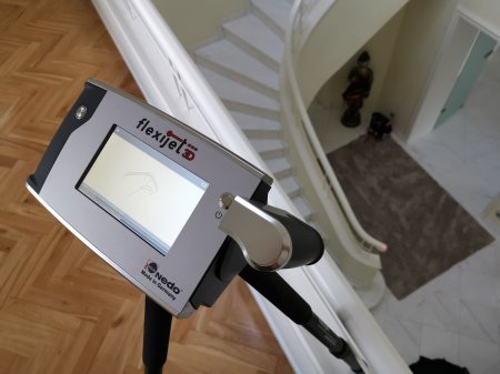 Wir messen Digital mit lasergestützen Aumaßsystemen. Wir erfassen vor Ort schnell, exakt und zuverlässig alle nötigen Masse. "Maße sind am Bau zu nehmen" Mit unserem lasergestützen Aufmaß der neusten Generation der Firma Flexijet messen wir die genauen Maße vor Ort, Jedes gewünscht Maß, jeder benötigte Winkel kann gemessen werden. Die Daten werden bereits auf der Baustelle als CAD Datei gespeichert. Die Masse sind zusammenhängend. Auch verwinkelte und schiefe Wände und Objekte können exakt eingemessen werden. Die Genauigkeit beträgt 1mm/10m, jede Wasserwage und jeder „Zollstock“ ist ungenauer" Für den Kunden und uns bedeutet, dass Sicherheit, Genauigkeit und Kostenersparnis. Bei einem üblichen Handaufmaß kann es bei der Montage zu aufwändigen Anpassarbeiten kommen, da von Hand nicht alle Maße ermittelt werden können. Zudem haben die von Hand genommen Maße keine Verbindung zueinander. Ein Winkel maß ist ein Winkelmaß und eine Wandlänge ist eine Wand Länge. Beim Digitalaufmaß werden alle Maße miteinander verbunden und es können eventuell benötigte Zwischenmaße im Nachhinein ermittelt werden, ohne nochmal auf die Baustelle zu fahren. Bei der Montage ergeben sich dann nur noch kleinere Bauartbedingte Anpassarbeiten, das spart Zeit, Material und sorgt für einen bessere Passgenauigkeit der Treppe in dem Bauwerk, denn bei einer Treppe kommt es auf jeden mm an.